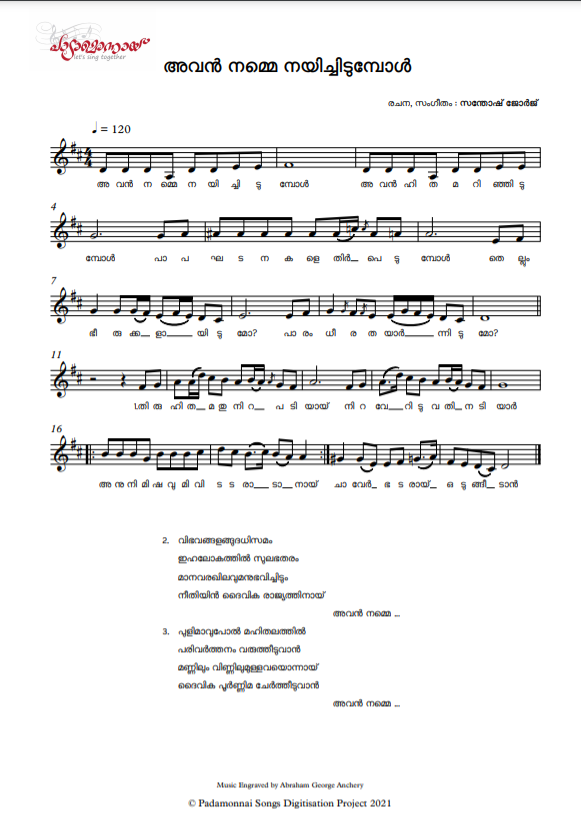 Avan Namme Nayichidumbol is one of my favourites from Padamonnai collections. For the first time I heard this song from Sam Philip sir when I was sitting behind Marthoma college chapel, Thiruvalla. Later there were many opportunities to get into the real meaning and context of the song. My ennamma Bhavanam days, reminds me of the theological discussions on Padamonnai songs after evening prayer. Even today we as family sing and discuss the serious questions from the song. I was attracted to this song due to three specialities such as: Style, Rhythm, Theological narration and Zbove all the serious questions it raises about our real commitment and mission.